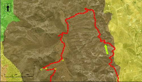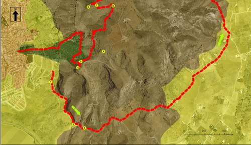 En una zona del itinerario en la que llegamos a unos cultivos de olivos y algarrobos, parece que se pierde el camino. En este punto giraremos a la derecha, dejando los cultivos a nuestra izquierda, para comenzar a bajar poco a poco por la ladera que tenemos en frente. Como referencia, podríamos tomar una vieja higuera que hay en el lugar (8).