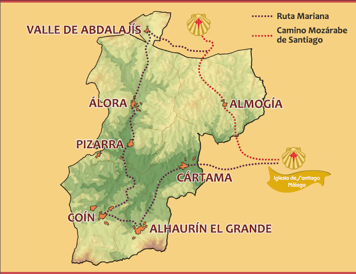 La ruta enlaza con el camino Mozárabe de Santiago, que parte de la iglesia de Santiago de la Ciudad de Málaga hasta llegar al Valle del Guadalhorce a través del municipio de Almogía, donde el peregrino encontrará las flechas indicativas que le llevarán a abrazar al Santo Patrón de Santiago.